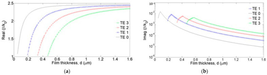 Real part (a) and imaginary part (b) of the propagation constant for the TE modes.