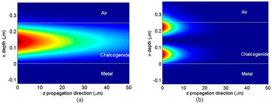 Two-dimensional plot of the intensity distribution in the SPR structure with a ChG film (with 0.25 μm thickness) for the TE0 (a) and TE1 (b) modes at 633 nm wavelength. More intense red colors mean greater intensity of the field. The dark blue color means that the field has a near-zero value. For the TE0 mode, the propagation of plasmonic waves is mainly through the center of the film, while for the TE1 mode, the energy propagates closer to the interface of the chalcogenide film with the adjacent media.