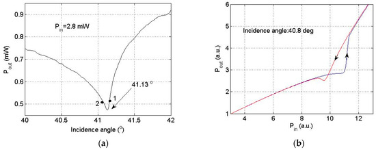 The data are very consistent with what the model predicted. At the initial stage, when the power of the incident light was low, the lowest reflection was obtained by setting the angle of incidence. The found angle of incidence was 41.13° (Figure 8a). The angle of incidence was then changed by rotating the structure down to 40.8° (near point 2 on the curve in Figure 8a). In this position, the dependence of the power output Pout as a function of incident power was measured. The results are shown in Figure 8b. A large loop of nonlinear hysteresis was established for laser beam power in the range of mW. Hysteresis was not observed for initial angle settings greater than 41.13°, near point 1.