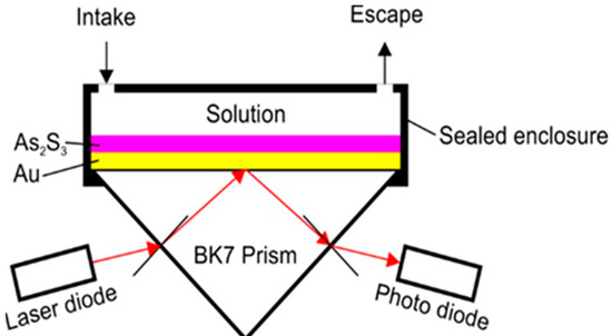 Chalcogenide (ChG) materials have high transparency in the IR region as well as a high refractive index [24]. A surface plasmon resonance (SPR)-based biosensor using the amorphous ChG material Ge20Ga5Sb10S65 (called 2S2G) as a coupling prism [25] enabled a sensing limit for refractive index variation of 5 × 10−5.