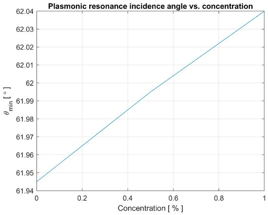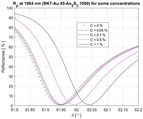 In this section, concrete numerical calculations of SPR for some alcohols of practical importance are presented briefly. The sensor optimization was undertaken by adjusting the thickness of the ChG films. We presented the results in more detail in a previous paper [76]. The structure is in contact with the liquid to be investigated, in our case, alcohol. The specific alcohols are disclosed by measuring the resonance incident angle. Three cases with different thicknesses were considered. The films made of amorphous arsenic sulfide have thicknesses of 800 nm, 1000 nm, and 1100 nm. The wavelength of interrogation was 1550 nm, and the gold film was of 40 nm thickness.