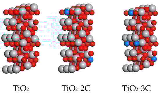 Microstructure of TiO2 and TiO2 doped with different concentrations of C (the gray sphere represents Ti, the red sphere represents O, and the blue sphere represents C).