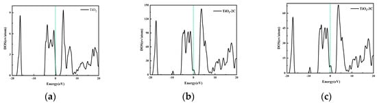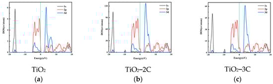 PDOS of (a) TiO2 (b) TiO2-2C and (c) TiO2-3C. The green dashed line represents the Fermi energy level.
