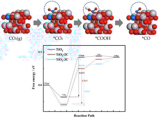 Figure 4, exemplifying the TiO2-2C configuration, provides a representation of the atomic adsorption process occurring at each stage of CO2 reduction. Through the simulation of intermediate structures, it becomes possible to derive the respective free energy changes associated with each of these processes. This comprehensive analysis is of paramount importance in advancing our understanding of CO2 reduction mechanisms. Initially, during the carbon dioxide adsorption process, CO2 molecules chemically adsorb on the TiO2 surface, forming *CO2 intermediate species. The activated molecules are denoted by asterisks. This adsorption process releases heat, indicating favorable energy for carbon dioxide adsorption on TiO2. This initial adsorption serves as a crucial starting step for subsequent intermediate formation. The results reveal that TiO2-2C and TiO2-3C require energy of −0.29 eV and −0.36 eV, respectively, for CO2 adsorption, both of which are lower than pure TiO2 (−0.18 eV). This suggests that TiO2 doped with carbon is more prone to CO2 adsorption, attributed to its structural bandgap. Enhanced conductivity can provide electrons to CO2, allowing it to closely bind to the crystal plane.