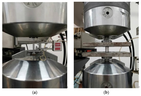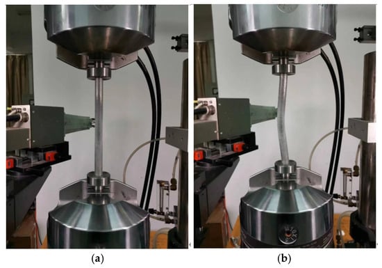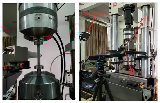 Tension and compression tests of specimens were performed with the MTS-809 testing machine. The tension test system and compression test system are shown in Figure 4.