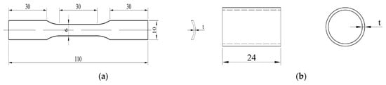 In order to ensure the accuracy of subsequent finite element simulation, tensile and compressive mechanical property tests on PMMA and 6063 aluminum alloy were conducted, which could provide the material performance data required for finite element calculations. The standard dimensions of the tensile specimens are determined according to ASTM E8 “Standard Test Methods for Tension Testing of Metallic Materials” [18], shown in Figure 3a. The compression specimens are designed according to “GBT7314-2017 Room Temperature Compression Test Methods for Metallic Materials” [19], shown in Figure 3b.