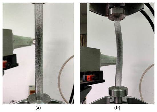 The PMMA specimen parameters are shown in Table 1. The boundary conditions are set as simply supported at both ends (allowing axial rotational freedom). The testing machine’s loading speed is set at 0.0005 mm/s. The compressive load is slowly applied to the PMMA specimen. The shape of the specimen before and after buckling during the testing process is illustrated in Figure 5.