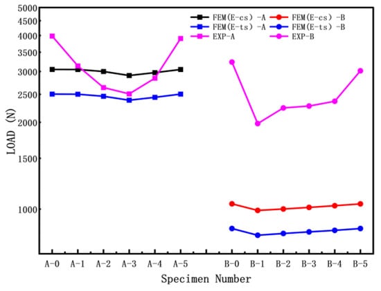 Due to the limit in processing conditions, the crack gap is close to 1 mm wide for the PMMA cylindrical shell. Finite element simulations were conducted to calculate the elastic buckling load of the PMMA cylindrical shell, considering the crack morphology. The experimental results (Exp) were compared with the finite element simulation results, as shown in Figure 6. The finite element simulations took into account the influence of elastic modulus and boundary conditions. In the A Group of experiments, as depicted in Figure 6, specimens A-1 and A-2 exhibited significant crack closure during the compression process. Therefore, in the finite element simulations for specimens A-1 and A-2, the effect of crack surface contact was considered. In the simulations, FEM (E-cs) utilized the elastic modulus obtained from compression tests, while FEM (E-ts) used the elastic modulus obtained from tensile tests. The boundary conditions were set as simply supported at both ends, allowing axial rotational freedom.