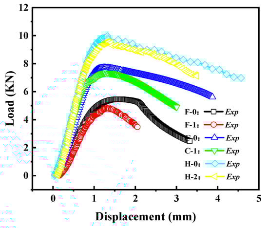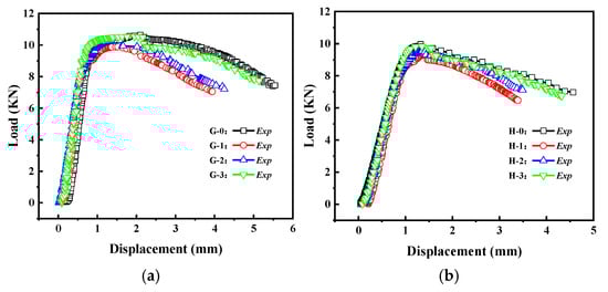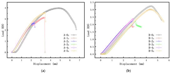 Load–displacement curves for specimens Group A and Group B: (a) Group A specimen; (b) Group B specimen.
