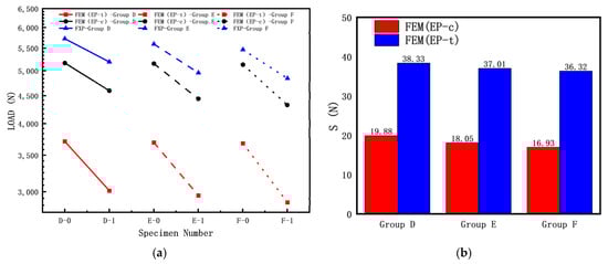 From Figure 10, it can be observed that the buckling load test values of the three specimens without cracks (D-0, E-0, F-0) are significantly higher than those of the specimens with cracks. As shown in Figure 10a, the experimental buckling load is higher than the calculated buckling load because the calculation did not consider crack surface contact. During the axial compression test, the crack surfaces of the cylindrical shells with cracks gradually close, resulting in a higher experimental buckling load compared to the calculated buckling load. For the three sets of specimens, the calculated buckling load using FEM (EP-c) is higher than the calculated buckling load using FEM (EP-t). As indicated in Figure 10b, for the Group D specimens, the calculated buckling load using FEM (EP-c) is closer to the experimental results than the calculated buckling load using FEM (EP-t), suggesting that using the compressive mechanical properties for calculating the elastic–plastic buckling load yields results closer to the experimental results.