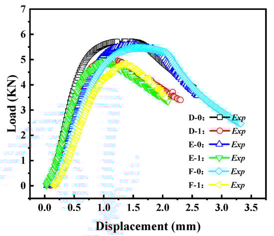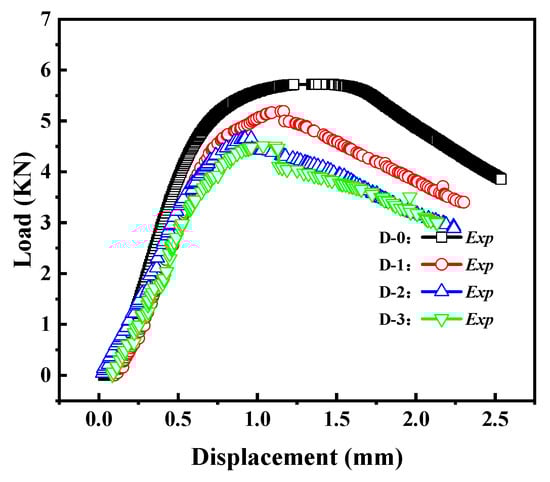 The load–displacement curves of the Group D specimens are shown in Figure 15. From the graph, it can be observed that as the crack length increases, the load–displacement curve gradually decreases, and the buckling load decreases accordingly. Additionally, with the increase in crack length, the post-buckling stage of the load–displacement curve also gradually decreases.