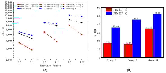 From Figure 12, it can be observed that the buckling load test values of the three specimens without cracks (F-0, C-0, H-0) are significantly higher than those of the specimens with cracks. As shown in Figure 12a, the experimental buckling load is higher than the calculated buckling load, and for all three groups of specimens, the calculated buckling load using FEM (EP-c) is higher than the calculated buckling load using FEM (EP-t). Based on the results shown in Figure 12b, for the Group D specimens, the calculated buckling load using FEM (EP-c) is closer to the experimental results than the calculated buckling load using FEM (EP-t), indicating that the elastic–plastic buckling load based on the compressive mechanical properties are closer to the experimental results.