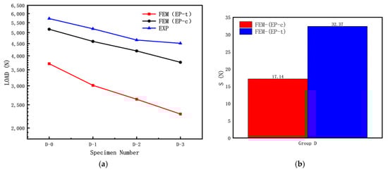 From Figure 14, it can be observed that in the Group D specimens, the buckling load test value of the specimen without cracks (D-0) is significantly higher than that of the specimens with cracks. As shown in Figure 14a, the experimental buckling load is higher than the calculated buckling load, and for the Group D specimens, the calculated buckling load using FEM (EP-c) is higher than the calculated buckling load using FEM (EP-t). Based on the results shown in Figure 14b, for the Group D specimens, the calculated buckling load using FEM (EP-c) is closer to the experimental results than the calculated buckling load using FEM (EP-t), indicating that using the compressive mechanical properties for calculating the elastic–plastic buckling load yields results closer to the experimental results.