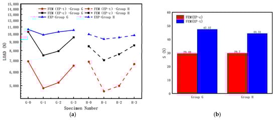From Figure 16, it can be observed that in the Group G (L = 120 mm, shorter cylindrical shell) and Group H (L = 200 mm, longer cylindrical shell) specimens, the buckling load test values of the specimens without cracks (G-0, H-0) are significantly higher than those of the specimens with cracks. Both the Group G and H specimens show that the calculated buckling load by FEM (EP-c) is higher than the calculated buckling load by FEM (EP-t). Based on the results shown in Figure 16b, for both the Group G and H specimens, the calculated buckling load by FEM (EP-c) is closer to the experimental results than the calculated buckling load by FEM (EP-t); the elastic–plastic buckling load also indicates that the calculated loads by compressive mechanical properties are closer to the experimental data (results). The variety range of elastic and elastic–plastic buckling loads under the same parameters are some different, which is similar to the results in reference to Li [20]. Variational trends in the elastic–plastic buckling load for Group G are consistent, which is different from that elastic buckling load for Group A. In contrast, the trends in Group H and Group B are similar.