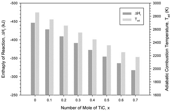 Enthalpies of reaction (ΔHr) and adiabatic combustion temperatures (Tad) of Equation (1) as a function of number of moles of TiC.