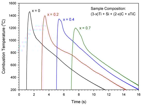 Figure 3 plots the temperature profiles measured from the samples without extra Si and Al, but containing different amounts of TiC. A temperature profile detected from a TiC-free element powder compact (x = 0) was included for comparison. All profiles exhibited a steep temperature rise followed by a rapid descent, which is typical of the SHS reaction that features a fast combustion wave and a thin reaction zone. The peak value was considered as the combustion front temperature (Tc). Due to the dilution effect of TiC on combustion, Figure 3 shows a decrease in peak combustion temperature from 1464 °C for the TiC-free sample to about 1200 °C for the TiC-containing sample of x = 0.7. The descending trend was consistent with the calculated adiabatic temperature. On the other hand, the addition of extra Si and a small amount of Al essentially had little influence on the combustion temperature. Experimental measurements indicated that the temperature variation induced by adding extra Si and Al was within ±20 °C of the value detected from the 3Ti-Si-2C stoichiometric sample.