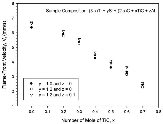 The effects of TiC, Si, and Al on the combustion front propagation velocity are presented in Figure 4, indicating a substantial decrease in the flame-front speed with TiC content from 6.7 mm/s for the elemental 3Ti-Si-2C sample to 2.3 mm/s for the TiC-containing sample of x = 0.7. As the layer-by-layer heat transfer from the reaction zone to an unburned region plays an important role in establishing combustion wave behavior, the propagation speed is strongly affected by the combustion front temperature. Such a great decrease in the combustion wave velocity could be a consequence of the dilution effect of TiC on combustion and the change in the reaction mechanism from a liquid–solid reaction mode to one dominated by solid-phase species, as discussed above. In particular, the combustion wave of the sample with x = 0.7 propagated in a spinning manner, which prolonged the total reaction time and reduced the propagation rate.