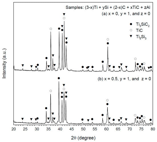 Figure 5a,b show XRD patterns of the final products synthesized from the elemental 3Ti-Si-C sample and the TiC-containing sample of x = 0.5, respectively. No extra Si and Al were employed in the samples of Figure 5. The final products were composed of three constituent phases, Ti3SiC2, TiC, and Ti5Si3. The diffraction peak intensity of Ti3SiC2 relative to that of either TiC or Ti5Si3 is noticeably amplified in Figure 5b when compared with that of Figure 5a. This justified the role of TiC as the reactant in enhancing the formation of Ti3SiC2 by the SHS process because TiC is one of two major intermediates to form Ti3SiC2.