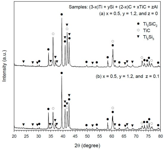 The effects of Si and Al on the formation of Ti3SiC2 can be seen in Figure 6, which presents XRD spectra for TiC-containing samples of x = 0.5 with excess Si and the addition of Al. Figure 6a reveals that for the Si-rich sample without Al additions, the dominancy of Ti3SiC2 over TiC and Ti5Si3 was stronger than that observed in Figure 5b. This indicated that the sample with Si in excess of 20 mol.% improved the yield of Ti3SiC2 as extra Si compensated for the evaporation loss of Si at high temperatures. For the Si-rich/Al-added sample, Figure 6b indicates that the addition of a small amount of Al further augmented the XRD peak intensity of Ti3SiC2. According to Zhang et al. [], Al can aid the formation of a liquid phase in the Ti-Si-C-Al system, and the liquid facilitates the diffusion of Ti and Si atoms and promotes the evolution of Ti3SiC2. As a reaction promoter, Sun et al. [] pointed out that Al of a small quantity could evaporate from the grain boundary, rather than forming a solid solution in Ti3SiC2.