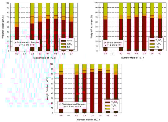 Weight fractions of Ti3SiC2, Ti5Si3, and TiC in the products synthesized from (a) stoichiometric samples of y = 1 and z = 0, (b) Si-rich samples of y = 1.2 and z = 0, and (c) Si-rich/Al-added samples of y = 1.2 and z = 0.1.