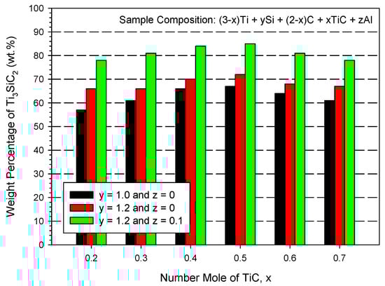 The weight percentages of Ti3SiC2, TiC, and Ti5Si3 in the products associated with the three initial sample compositions were calculated and are presented in Figure 7a–c. For the stoichiometric samples with Ti:Si:C = 3:1:2 (i.e., y = 1 and z = 0), Figure 7a shows that for the TiC-free sample, the resulting product was composed of 50 wt.% Ti3SiC2, 41 wt.% TiC, and 9 wt.% Ti5Si3. The TiC-containing sample was found to increase the formation of Ti3SiC2; a maximum yield of 67 wt.% was detected at x = 0.5, in which the fractions of the other two phases were 26 wt.% TiC and 7 wt.% Ti5Si3. However, a further increase in the TiC content to x = 0.6 and 0.7 decreased the yield percentage of Ti3SiC2, possibly due to a reduced reaction temperature.