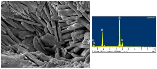 SEM image and EDS spectrum of the product synthesized from the Si-rich/Al-added sample with composition parameters of x = 0.5, y = 1.2, and z = 0.1.