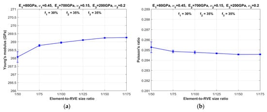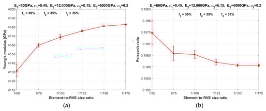 Variation in RVE properties of composite SPC303535 with element-to-RVE size ratio: (a) Young’s modulus; (b) Poisson’s ratio.