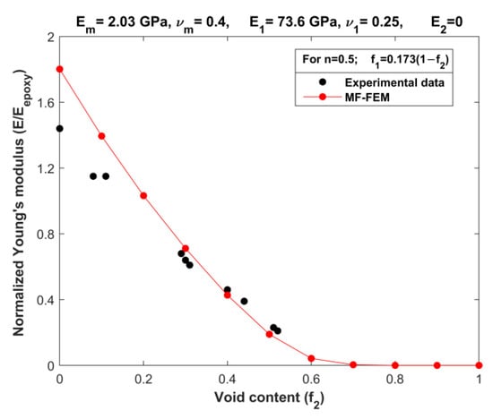 The availability of comprehensive experimental data on the elastic properties of three-phase particulate composites covering a wide range of volume fractions is limited. One noteworthy set of experimental data was conducted by Cohen and Ishai [20], where they investigated three-phase composites consisting of an epoxy matrix with quartz-sand fillers and voids. Cohen and Ishai’s experiments encompass testing data for both tension and compression on three different sets of composites, each having a constant filler-to-matrix weight ratio (n) of 0.5, 1, or 1.5. For our validation purposes, we specifically utilized the compression data of the composites with a filler-to-matrix weight ratio of n = 0.5. To establish a relationship between the volume content of sand (f1) and the void content (f2) for composites with a filler content of n = 0.5, we used the densities listed in Table 3. Consequently, we derived a simple expression for the relationship: f1 = 0.173(1 − f2).