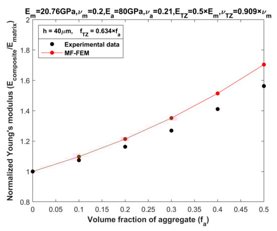 Another set of experimental data utilized for validation comes from Yang [21], which pertains to mortar with a transition zone (TZ). This is viewed as a three-phase composite without voids. Yang’s study focused on the behavior of transition zone and its influence on the elastic modulus of mortar. His research established that the overall modulus of mortar is subjected to the elastic properties and volume content of the TZ, which functions as the third phase between the aggregate and cement paste. Through a comparative analysis of theoretical outcomes and empirical data, Yang inferred that the volume fraction of TZ can be estimated from aggregate volume fraction (fa) by