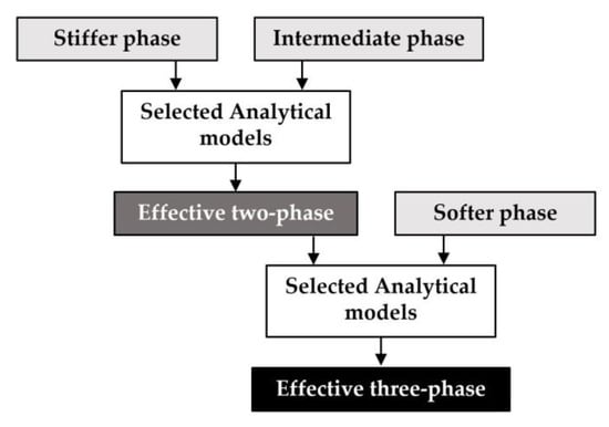 The analytical models presented below are widely employed for calculating the elastic properties of two-phase particulate composites. Some of the models require a clear identification of the matrix and inclusion phases as input and are extended to predict the properties of three-phase composites by applying expressions between two materials and combining the resulting effective properties with the third material using the same expression. However, the selection of two phases from three materials can be performed in multiple ways, leading to minor discrepancies in the final predictions depending on the initial choice. To minimize the effect of this discrepancy, we maintain consistency in phase selection during the initial calculations. Specifically, we consistently choose stiffer and intermediate phases for all models and combine the resulting two-phase effective properties with the softer phase to obtain the final properties of three-phase composites (see Figure 7). MF-FEM overcomes this limitation by producing a single output regardless of phase type. For the range of phase fractions where experimental data are lacking, we utilize MF-FEM results as a substitute to evaluate and compare the performance of various analytical micromechanics models.