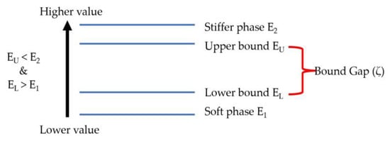 The Voigt–Reuss and Hashin–Shtrikman formulas are not able to obtain exact elastic properties because of the anisotropy present in the micromechanics model considered. Different attempts have been made to remove the anisotropy in the VR/HS formulas [23,25], but they are one-time isotropization and are not effective for models with strong anisotropy. As a result, the iterative isotropization model is introduced as an effective method, in which the gap between bounds is reduced iteratively by replacing the elastic moduli of the harder and softer phase with calculated upper and lower bounds, respectively, in each step. The gap (ζ) between the upper and the lower bounds is calculated using Equation (10) and illustrated in Figure 8.