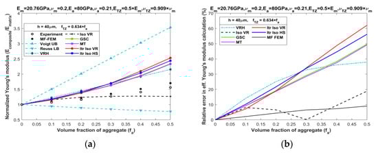 Comparison of MF-FEM and analytical models against experimental data by Yang [21]: (a) Young’s modulus prediction; (b) relative error in effective Young’s modulus calculation.