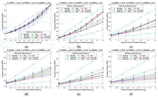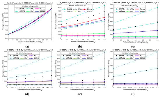 Effective Young’s moduli of LPC composites characterized by MF-FEM and analytical micromechanics models with (a) 0%; (b) 20%; (c) 40%; (d) 50%; (e) 60%; and (f) 80% of the softer phase.