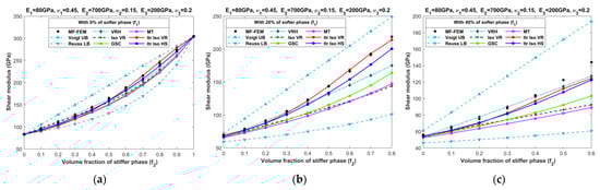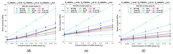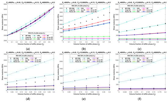 Effective shear moduli of LPC composites characterized by MF-FEM and analytical micromechanics models with (a) 0%; (b) 20%; (c) 40%; (d) 50%; (e) 60%; and (f) 80% of the softer phase.