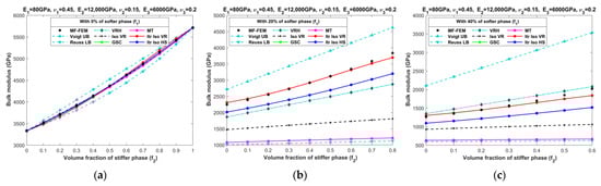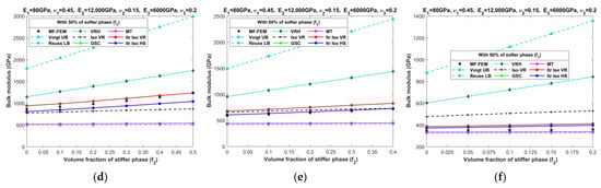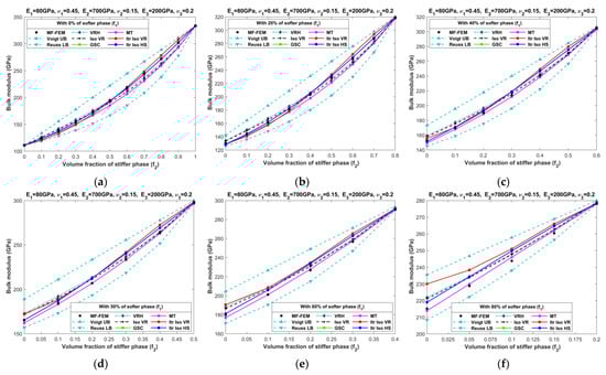 Effective bulk moduli of LPC composites characterized by MF-FEM and analytical micromechanics models with (a) 0%; (b) 20%; (c) 40%; (d) 50%; (e) 60%; and (f) 80% of the softer phase.