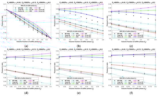 Effective Poisson’s ratios of SPC composites characterized by MF-FEM and analytical micromechanics models with (a) 0%; (b) 20%; (c) 40%; (d) 50%; (e) 60%; and (f) 80% of the softer phase.