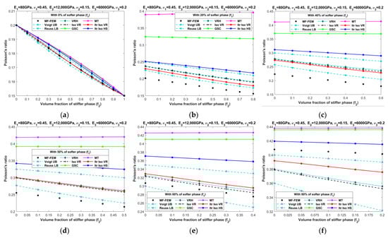 Effective Poisson’s ratios of LPC composites characterized by MF-FEM and analytical micromechanics models with (a) 0%; (b) 20%; (c) 40%; (d) 50%; (e) 60%; and (f) 80% of the softer phase.
