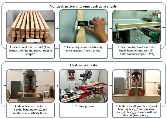 The analysis included pine, spruce, and fir beam elements with dimensions of approximately 50 mm × 50 mm × 1000 mm. To obtain a sample diverse in terms of density, wood from many different habitats in Central Europe was used. All these species can be classified as soft coniferous wood—these are currently the most commonly used species in construction in this region. The beams were seasoned for three months in a room where the average temperature was approximately +21 °C and the humidity was between 50% and 60%. The humidity of the beams at the time of testing was between 11.1% and 11.7%. Figure 1 schematically presents the conducted research procedure.