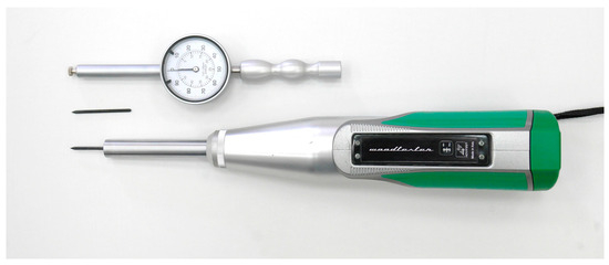 Sclerometric tests were performed using a device (Woodtester Novatest Ancona, Italy) with an impact energy of 2.4 J equipped with steel needles of 60 HR hardness, a diameter of 2.5 mm with a conical tip inclined at 35° and a length of 50 mm, and a dial gauge enabling measurement with an accuracy of 0.01 mm. The device was calibrated on a control anvil with a hardness of >52 HRC. The device manufacturer suggests five hits in one test point, however, for soft coniferous wood, five hits cause a needle indentation larger than the device’s measurement scale. The markings were made for a horizontal device layout for a single (PD1) and double (PD2) indentation/hit (i.e., a double hit on the needle without prior removal). The measured value was the remaining portion of the needle that was not indented. The difference between the length of the needle and the measured size was treated as the measurement result. After taking readings after the first and second indentation, the needles were removed from the element using hand tools. The measurement set is shown in Figure 2.