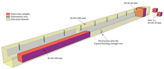 Destructive tests were carried out in two stages: in the first stage, the full-sized element was tested for its four-point bending strength and longitudinal modulus of elasticity, in the second stage, after cutting the previously destroyed element, bending and compression strength tests were carried out on small, flawless samples. In addition, the density of the defect-free sample was also determined [25]. An example of an element cutting scheme after destruction is shown in Figure 3.