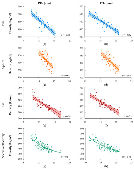 Relationship between volumetric density and the result of the sclerometric test PD: (a) pine—single impact, (b) pine—double impact, (c) spruce—single impact, (d) spruce—double impact, (e) fir—single impact, (f) fir—double impact, (g) species collectively—single impact, and (h) species collectively—double impact.