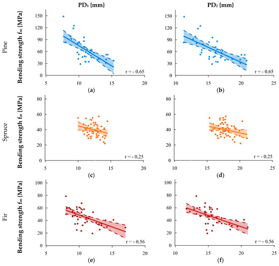 Figure 5 shows the correlation between the bending strength (determined by the element on a technical scale) and the sclerometric test for single (PD1) and double indentations (PD2). Similar to the correlation with density, the strongest correlation was obtained for pine wood and collective analysis, with a slightly lower correlation for fir wood; a very low correlation was obtained for spruce wood. During the study, correlations between the bending strength determined in the small defect-free sample test were also analyzed. The correlations obtained in this test were always higher than for tests of samples on a technical scale (with defects). This results directly from the large and somewhat unpredictable influence of wood defects and their distribution on the bending strength of the element. For spruce beams on a technical scale, a weak correlation (r = 0.25) was obtained. While analyzing defect-free samples taken from the same beams, the correlation coefficient for the penetration depth–bending strength relationship increased to r = 0.50 (PD1) and r = 0.51 (PD2). A similar increase in the correlation coefficient was observed for fir wood, while for pine wood, the registered increase was not as significant (increase in r by 0.05).