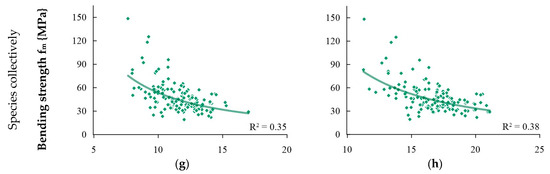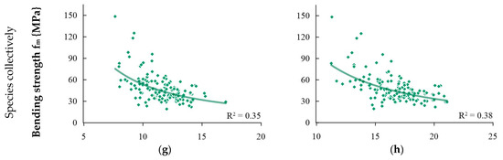 Relationship between the bending strength and result of the sclerometric test PD: (a) pine—single impact, (b) pine—double impact, (c) spruce—single impact, (d) spruce—double impact, (e) fir—single impact, (f) fir—double impact, (g) species collectively—single impact, and (h) species collectively—double impact.