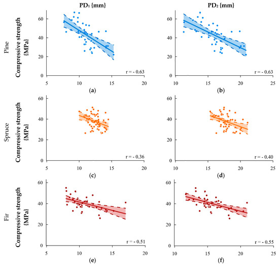 The second correlation found in the literature is the relationship between the depth of the sclerometer needle penetration and the compressive strength. These correlations are often weaker than those for density. In the studies by Kloiber, Tippner, and Hrivnák [31], a decrease in the value of r by 0.15 for spruce and fir wood was observed, along with a slight increase for pine wood. Meanwhile, Henriques et al. [35] obtained a correlation lower by 0.11 compared to the correlation with density. Lourenco, Feio, and Machado [34] obtained results below statistical significance, whereas, in the same studies for the correlation with density, the correlation coefficient r was equal to 0.87. On the other hand, Faggiano et al. [32] obtained a strong correlation for historical chestnut wood using the Woodtester device, which was greater by 0.21 than in the case of the same tests for density. This variation may result from different compressive strength testing methods (sample size) and a more challenging interpretation of the destructive loads for small compression samples. For the analyzed results of our research, a lower correlation coefficient value was obtained in every case than for the correlation with the density of the sawn timber—this decrease averaged 0.2.