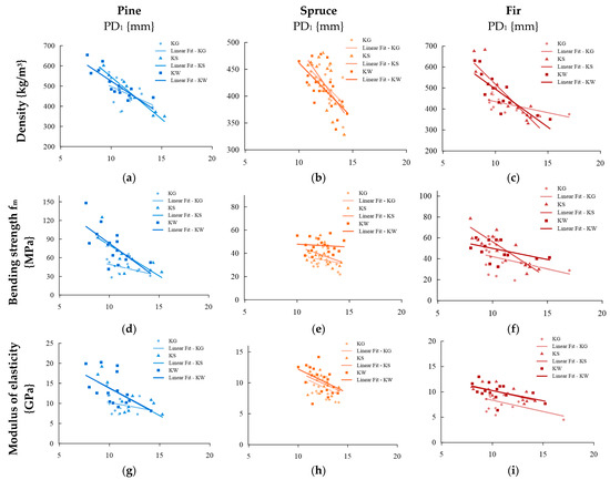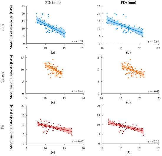 In Figure 7, the correlation between the longitudinal modulus of elasticity and the sclerometric test for single (PD1) and double indentations (PD2) is presented. Generally, the correlation of needle indentation for all species was lower than with other physico-mechanical characteristics. Nevertheless, as in previous correlations, the strongest correlations were obtained for pine wood and the lowest for spruce wood.