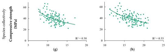 Relationship between the compressive strength and result of the sclerometric test PD: (a) pine—single impact, (b) pine—double impact, (c) spruce—single impact, (d) spruce—double impact, (e) fir—single impact, (f) fir—double impact, (g) species collectively—single impact, and (h) species collectively—double impact.
