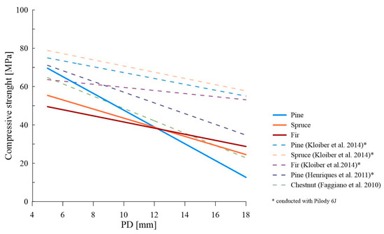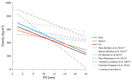 Figure 9 presents a comparison of the linear relationships obtained from our research (for a single impact) against the background of the works cited above with the note that some of the cited studies were performed using the Pilodyn 6 J device. Comparable to that presented in these studies, the direction of the slope of the curve (slope coefficient) was obtained by Henriques et al. [35], although the correlation value itself was definitely different (a much higher constant term in the regression equation). On the other hand, for penetration depths in the range of about 8 to 10 mm, the results obtained partially coincide with the dependencies derived by Kloiber et al. [31], however, their dependencies had a much lower slope coefficient. It is also worth noting the differences between the studies for pine wood performed by Henriques et al. [35] and Kloiber et al. [31] whose correlations were quite divergent, despite using the same device, especially for small penetration depths. This is probably due to the little diversified sample in the work [31] and also the different growth conditions of pine in the areas of conducted research.