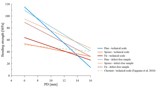 Figure 11 presents a comparison of the plotted derived linear dependencies from our research (both for the correlation to bending strength determined on a technical scale sample and for a small sample without defects) and the relationship derived by Faggiano et al. for chestnut wood. The literary relationship significantly deviates from the obtained results, which may be related to a completely different species of wood (deciduous non-heartwood wood of a diffuse-porous structure). The derived dependencies for tests performed on a technical scale differed significantly from each other within individual species, not only in terms of the y-intercept but also the slope coefficient. On the other hand, dependencies for tests performed on small samples without defects were decidedly more similar to each other, both in terms of the y-intercept and the slope coefficient. The arrangement of these three relationships in this case, almost throughout, was consistent with the literature data regarding mechanical properties (generally, the highest bending strength is characteristic of pine wood, intermediate for spruce wood, and the lowest for fir wood).