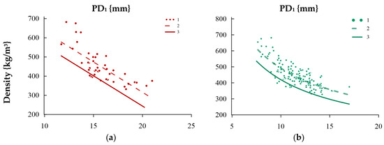 Example dependency relationships between the volumetric density and result of the PD1 sclerometric test corresponding to the characteristic values for (a) fir and (b) the species collectively. Legend: 1—test results, 2—correlation relationship, and 3—relationship corresponding to the characteristic value.