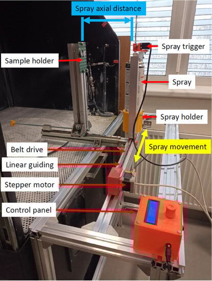 Spray movement was ensured by a stepper motor with a belt drive and linear guiding. Coating deposition from the spray can was turned on using a servo motor with a trigger placed on the top of the spray holder (see Figure 1). The trigger intensity was set the same for all used scanning sprays. Spray movement speed, number of deposited coating layers, and triggering of the spray were driven by a microcontroller Arduino placed in the control panel. The spray movement speed was set at a constant 800 mm/s for all performed experiments. The spray axial distance was also set as constant, and all coatings were deposited at a distance of 175 mm from the spray nozzle. The spray movement speed and deposition distance were set experimentally to avoid over-spraying after one spray pass. Coating deposition was conducted perpendicularly to the coated surfaces, and the spray axis was directed at the center of the sample. Four samples were created for each measurement. All experiments were performed under constant ambient conditions. The ambient temperature for all experiments was 21 ± 1 °C. All experiments were performed 2 min after the coating deposition to eliminate the effect of the ambient environment and the time-dependent behavior of the coatings.
